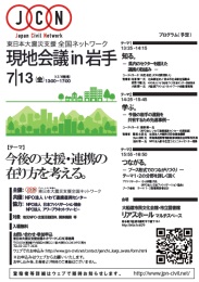 東日本大震災支援全国ネットワークでは、7月13日に「東日本大震災支援全国ネットワーク(JCN)現地会議 in 岩手」を開催いたします。つきましては、現地支援関係者の皆様、JCN参加団体(会員・協力団体)、関係機関の方はぜひご参加くださいますようご案内いたします。